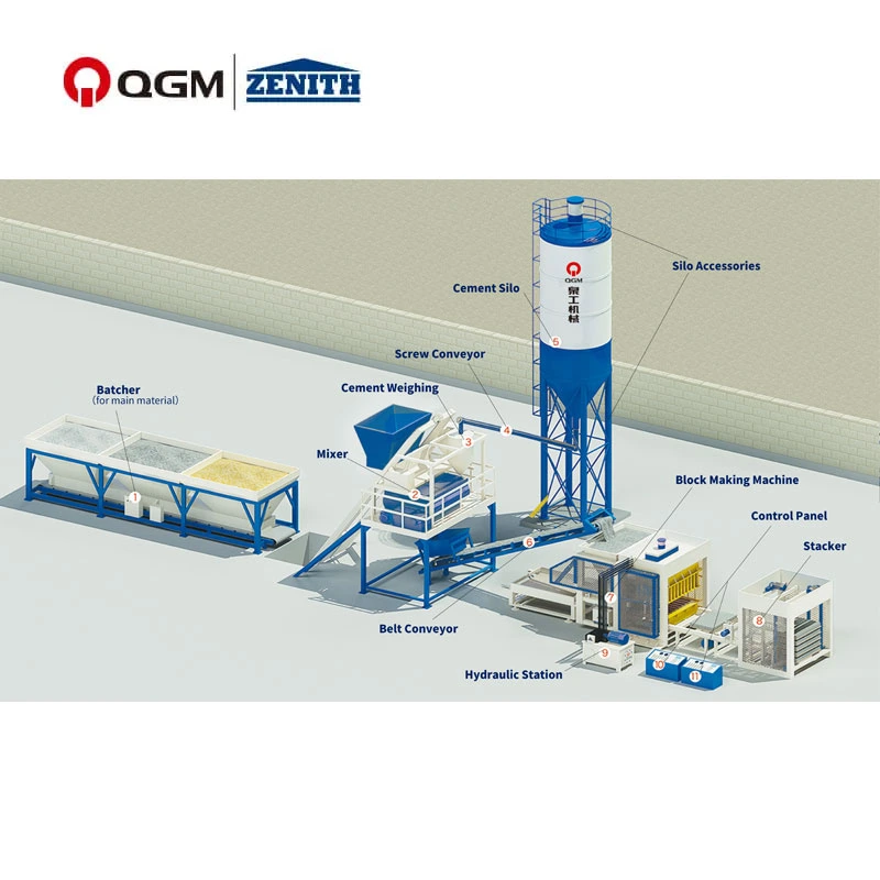 Automatický stroj na výrobu blokov je stroj, ktorý sa používa hlavne na výrobu nových blokov z materiálu stien, ktorý je jedným zo zariadení na výrobu tehál. Produkty vyrábané automatickým strojom na výrobu blokov môžu byť spracované na rôzne nové materiály stien pomocou priemyselných odpadových materiálov, ako je piesok, kameň, popolček, uhoľná troska, uhoľná hlušina, hlušina, keramzit, perlit atď. Automatický stroj na výrobu blokov využíva plne automatický riadiaci systém PLC s interaktívnym rozhraním človek-stroj. Riadiaci systém je nakonfigurovaný s bezpečným logickým riadením a má funkcie zobrazovania výrobného programu a diagnostiky porúch. Zlepšuje efektivitu výroby a znižuje potrebu manuálneho zásahu, vďaka čomu je celý výrobný proces inteligentnejší a automatizovanejší. Nahradením rôznych foriem môže automatický stroj na výrobu blokov vyrábať stenové bloky rôznych špecifikácií a tvarov, vrátane, ale nie výlučne, pórovitých tehál, dutých blokov, obrubníkov, chodníkových tehál, trávových tehál, šachovnicových tehál a iných cementových výrobkov.